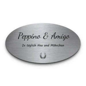 Edelstahl Futter-Schild für Pferd mit Namens-Gravur (15×8 cm)