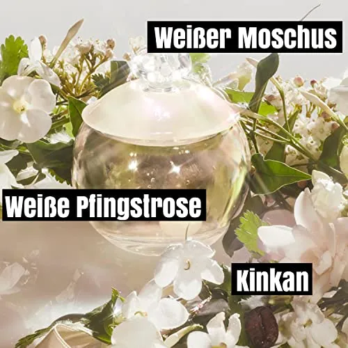 In der Basisnote sorgen weisser Moschus, Benzoe und Sandelholz für einen reinen Blumenduft.