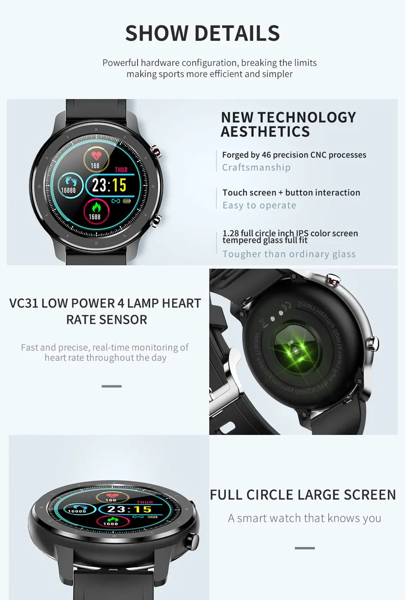 Full Touch Vollrundbildschirm. Automatische Anzeige des Displays beim Drehen des Handgelenks.