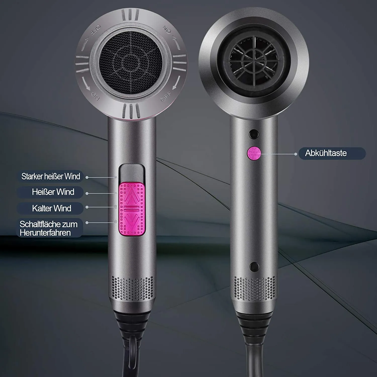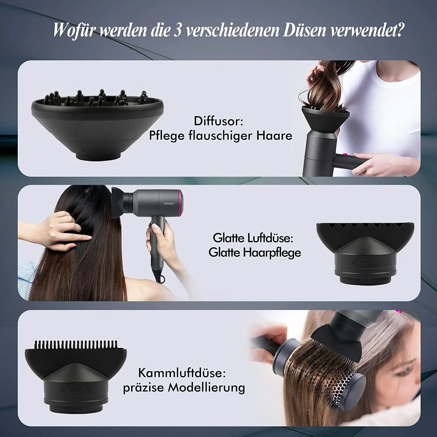 Kommt mit 2 Konzentratoren, 1 Diffusor für viele Frisuren.