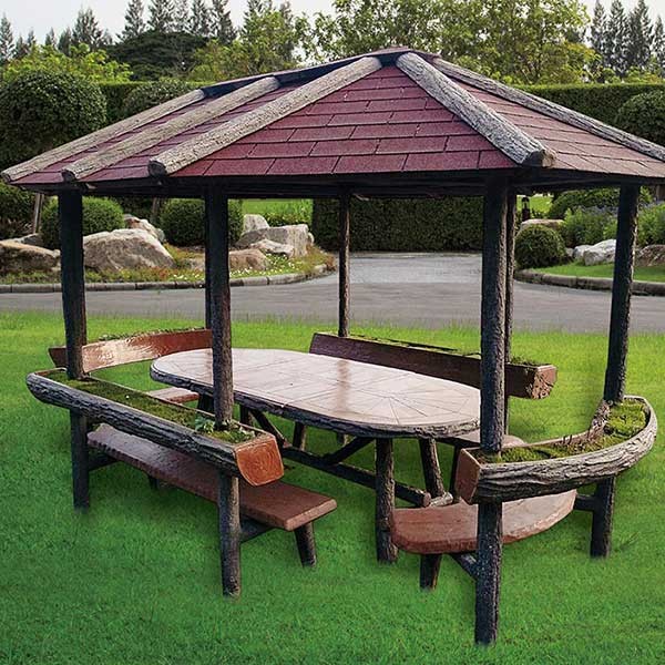 Das Gartenhaus besteht aus 1 Tisch (ca. 240×110 cm), 2 Bänken mit Blumentöpfen (Länge ca. 160 cm), 2 Bänken mit Blumentöpfen (Länge ca. 190 cm) sowie kanadischen Dachziegeln.