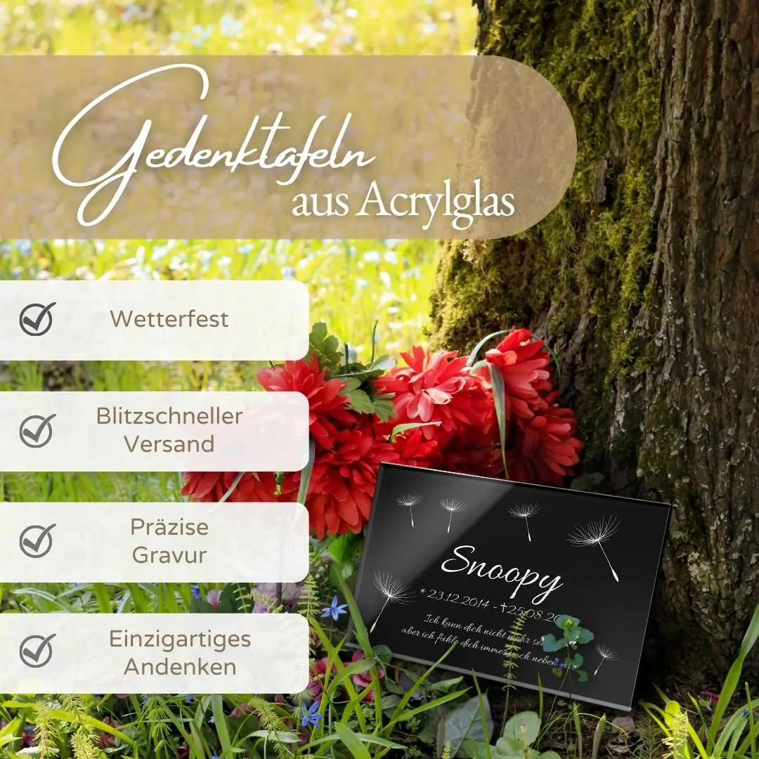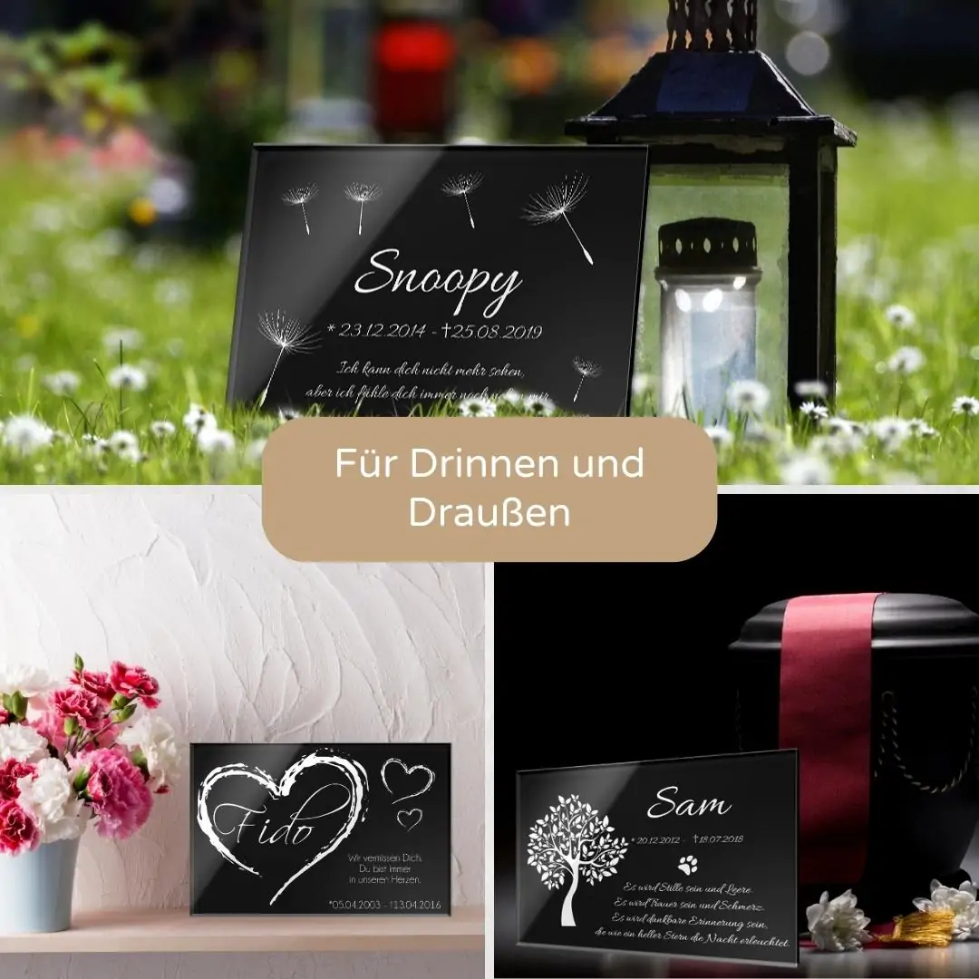 Ein geliebter Mensch oder ein treuer Vierbeiner wird auch nach dem Tod niemals aus Deinem Gedächtnis und aus Deinem Herzen verschwinden. Gestalte Dir ein einzigartiges Andenken, welches diese besondere Person, Deinen geliebten Hund oder Deine unersetzliche Katze für immer in Ehren hält. Bei uns kannst Du stilvolle aber doch persönliche Grabtafeln selbst gestalten. Wähle zwischen einem edlen Schwarz oder einem moderneren Anthrazit als Farbe Deiner Acrylglasplatte und halte auf dieser besondere Erinnerungen und schöne Momente fest.