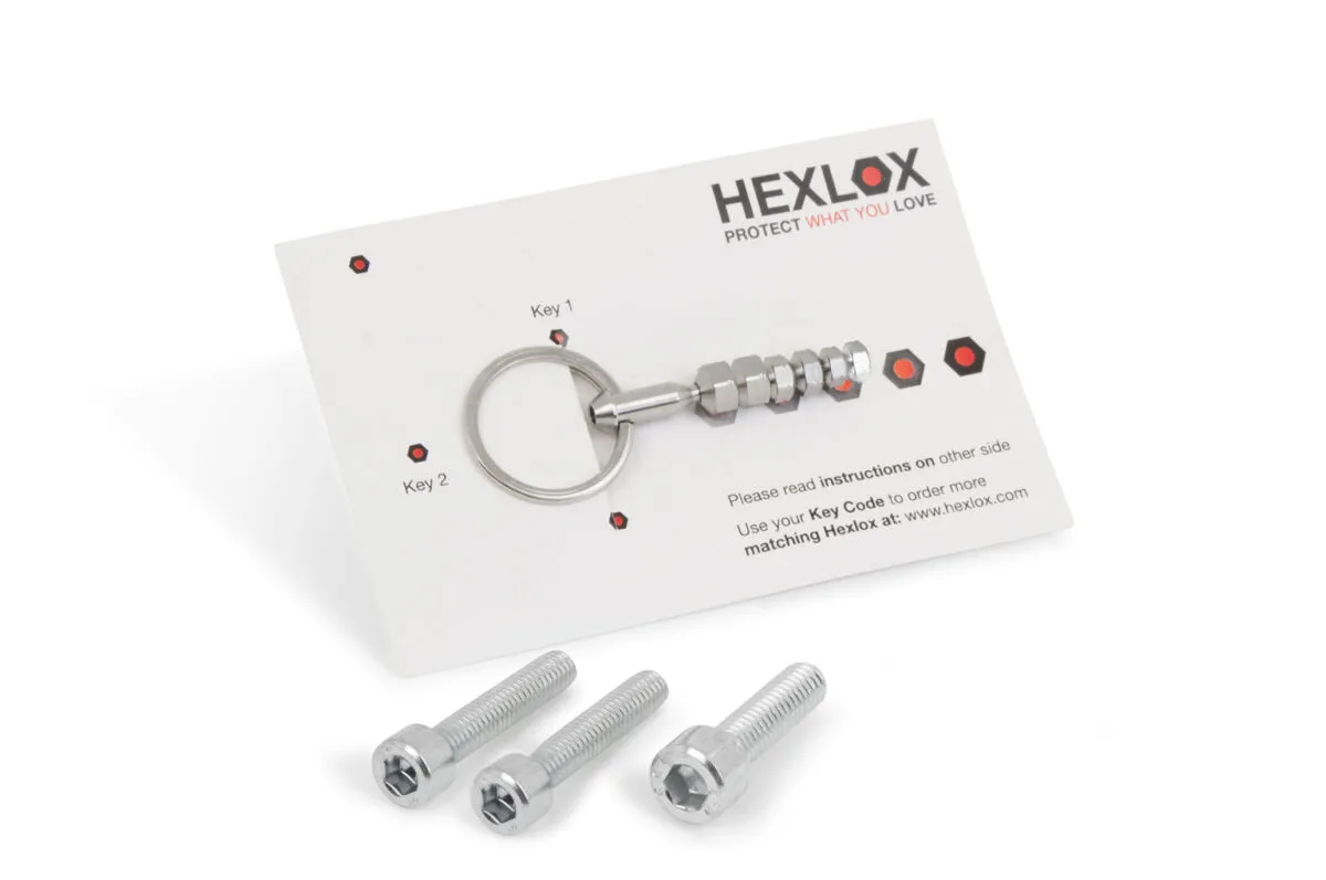 Hexlox funktioniert nur an Stahlschrauben, weshalb an unseren Modellen Edelstahl-Inbusschrauben ersetzt werden müssen, diese sind im Lieferumfang enthalten.