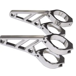 Das perfekte Set für Ihr Umbau-Vorhaben. Präzise verarbeitete Lampenhalter der Extraklasse, aufwendig CNC-gefräst und eloxiert. Das schwarze Lampenhalter-Set aus Aluminium enthält 4 Gabelrohrschellen sowie je 2 Halter und Reduzierstreifen. Durch mehrere Einstellmöglichkeiten wird das Ausrichten des Scheinwerfers an Ihrem Chopper, Cruiser oder Nakedbike vereinfacht. Die EXTEND Lampenhalter sind in der Länge verstellbar, so kann der Abstand für den Scheinwerfer variabel von ca. 35 mm bis 90 mm verstellt werden. An der Gabel befestigt, lässt sich der Scheinwerfer eng am Bike montieren. Die Halter sind so an den Schellen befestigt, dass sie auf die Scheinwerferbreite eingestellt werden können. Mit den beiliegenden Einlegestreifen kann der Durchmesser reduziert werden.