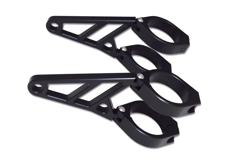 Das Set aus Aluminium enthält 4 Schellen zur Montage an den Standrohren sowie 2 Lampenhalter und Reduzierstreifen. Mit den beiliegenden Einlegestreifen kann der Durchmesser reduziert werden. Die Halter können durch verdrehen der Schellen an die Breite des Scheinwerfers angepasst werden. Sie besitzen eine Aufnahme zur Blinkerbefestigung bis zu einem M10-Gewindebolzen. Das perfekte Teil für Ihr Umbau-Vorhaben, erhältlich in Chrom oder Schwarz. Wählen Sie die gewünschte Größe aus.