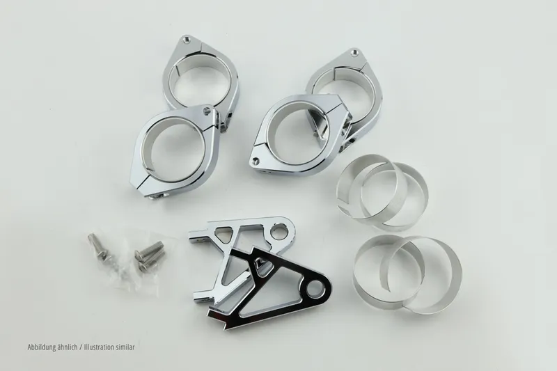 Die Halter aus CNC-gefrästem Aluminium sind so an den Schellen befestigt, dass sie auf die Scheinwerferbreite eingestellt werden können. Die Aufnahme zur Blinkerbefestigung ist geeignet für Gewindebolzen bis Größe M10. Mit beiliegenden Einlegestreifen kann der Durchmesser reduziert werden. Wählen Sie die gewünschte Farbe und Größe aus.