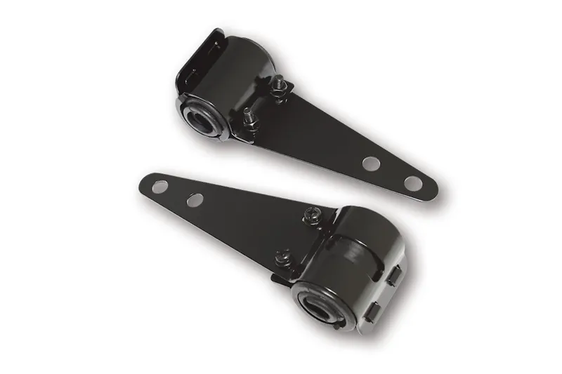 HIGHSIDER smart Universal Lampenhalter mit Distanzgummis, schwarz, Paar. Für Standrohrdurchmesser von 30 bis 38 mm. Maße ab Standrohr: bis Ende 130 mm, 1. Bohrung 85 mm, 2. Bohrung 115 mm (gemessen bis Lochmitte). Schellenhöhe 54mm. Bohrungsdurchmesser je 10 mm.