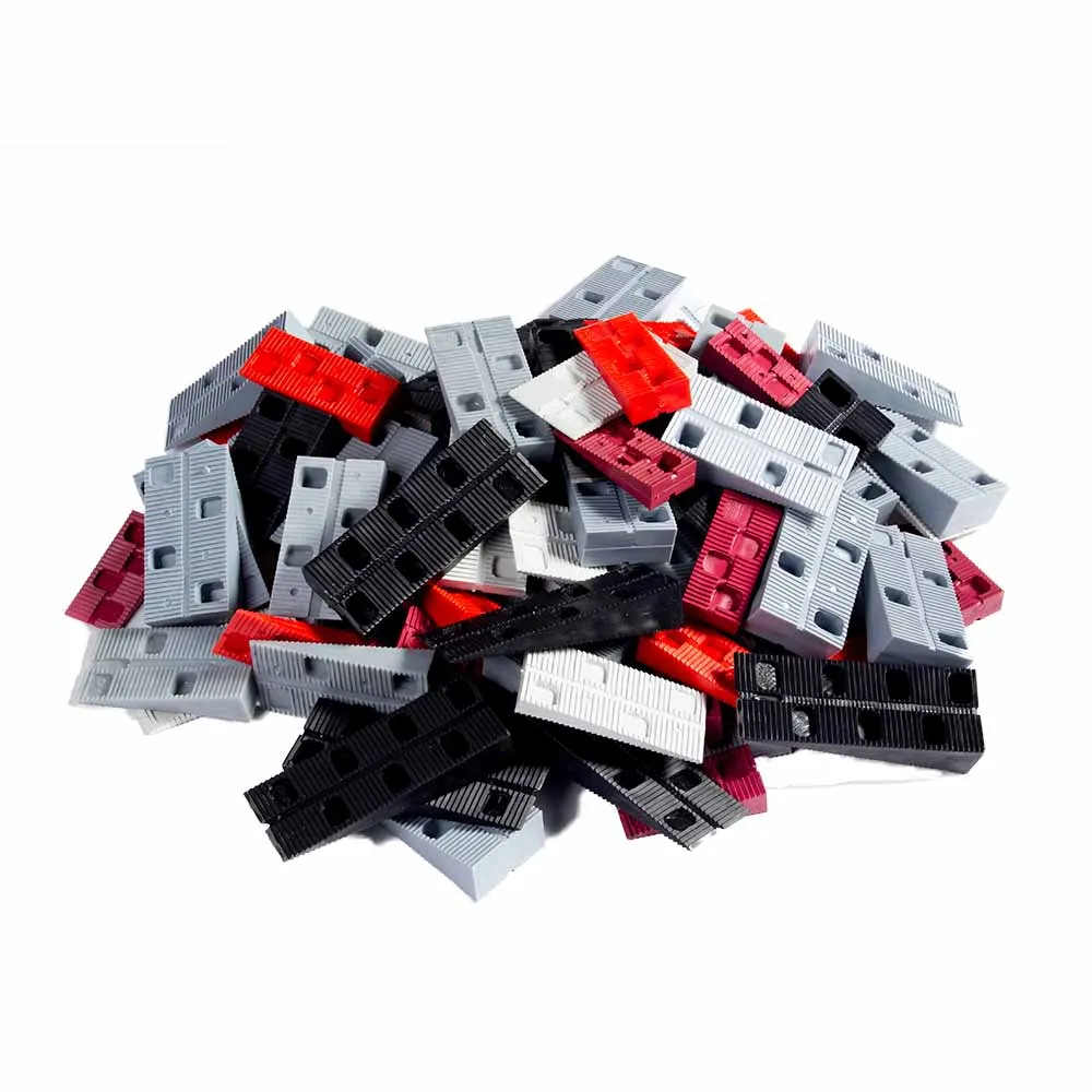 Die geriffelte Oberfläche unserer Kunststoff Keile ermöglicht das Stapeln der Keile aufeinander. Dies verhindert ein ungewolltes Verrutschen und bietet einen sicheren Halt, insbesondere bei größeren Abständen.