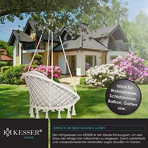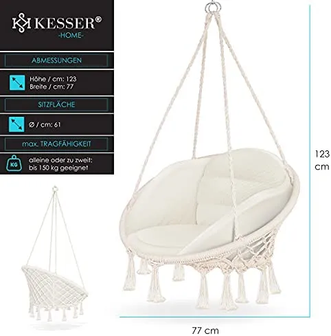 KESSER Chill Hängesessel in Makramee-Knüpftechnik mit weichen Kissen, Belastbar bis 150 kg, Outdoor und Indoor, verschiedene Farbausführungen, Ø Sitzfläche: ca. 61 cm