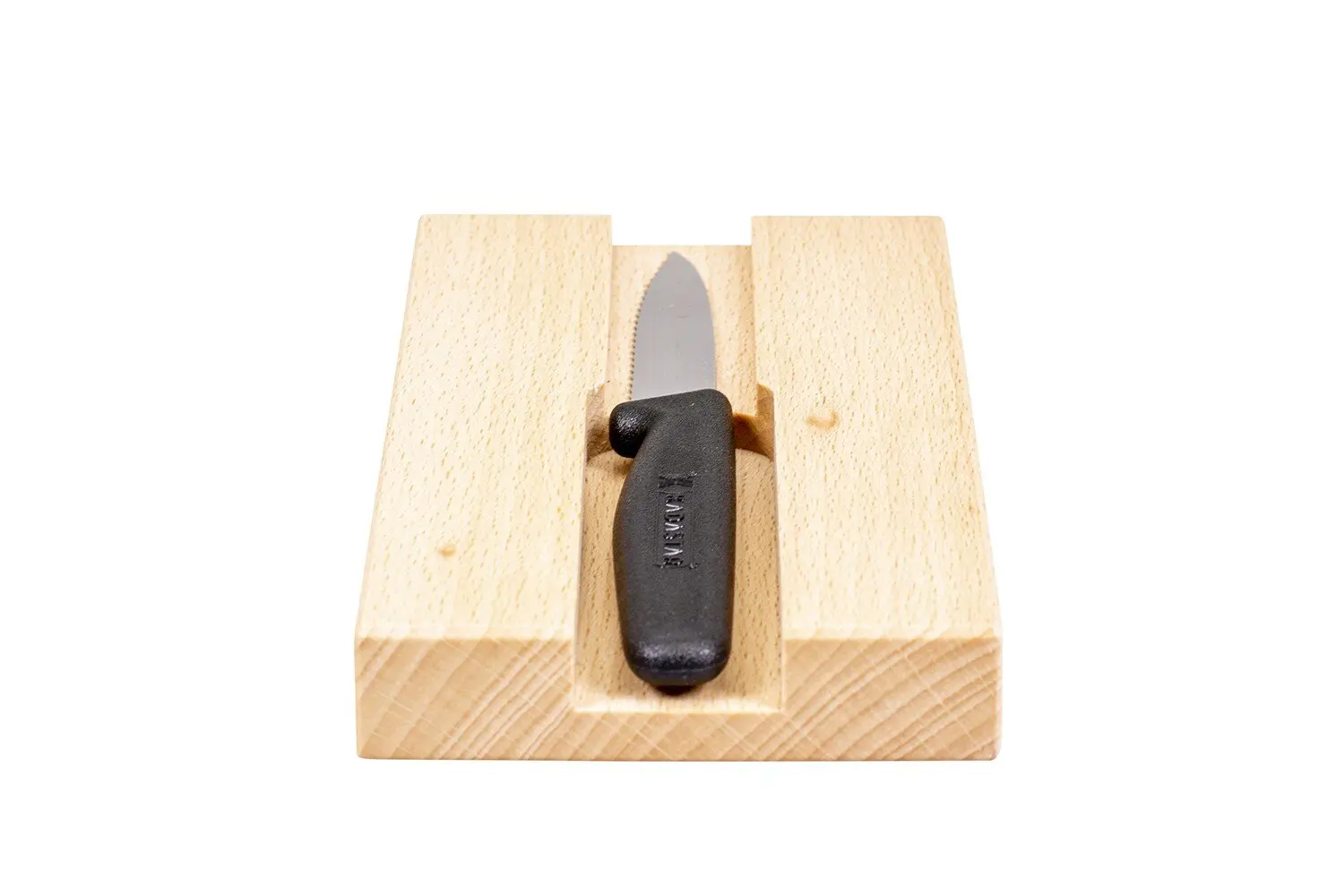 Das praktische Messerbrett aus Buchenholz hat auf der Rückseite eine Einfräsung und Magnet-Halterung, um das Messer befestigen zu können. Geliefert wird es mit Schneidemesser und in einem nützlichen Leinenbeutel mit Kordelzug.