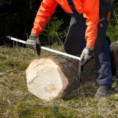 Die Form der Messkluppe erleichtert die Ablesung auch bei liegendem Holz