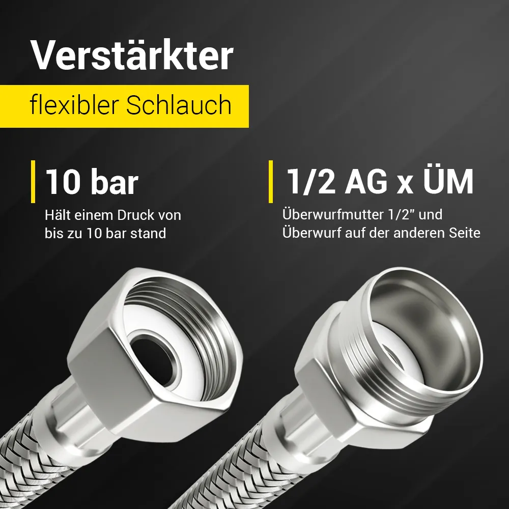 Panzerschlauch 2,5 m flexibel mit 1/2″ Überwurfmutter und Außengewinde für Sanitär