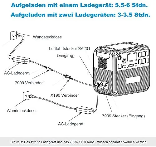 POWEROAK Normales Aufladen: Sie können ein Netzteil verwenden, um das AC200P in ca. 5,5-6 Stunden vollständig aufzuladen. Schnelles Aufladen: Aufladen über zwei Netzteile (insgesamt 800 W) gleichzeitig, was ca. 3-3,5 Stunden dauert! HINWEIS: Es ist nur ein Adapter enthalten. Der Kunde muss den zweiten Adapter + das Kabel DC7909 zu XT90 separat kaufen, um zwei Adapter aufladen zu können.[/vc_column_text][vc_empty_space height=“15px“][/vc_column_inner][vc_column_inner width=“1/3″][vc_column_text]