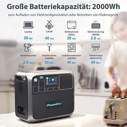 - Riesige Kapazität: 2000 Wh, Wechselrichter-Last: 2000 W (reine Sinuswelle), Überspannungsschutz 4800 W, 90% Geräte laden