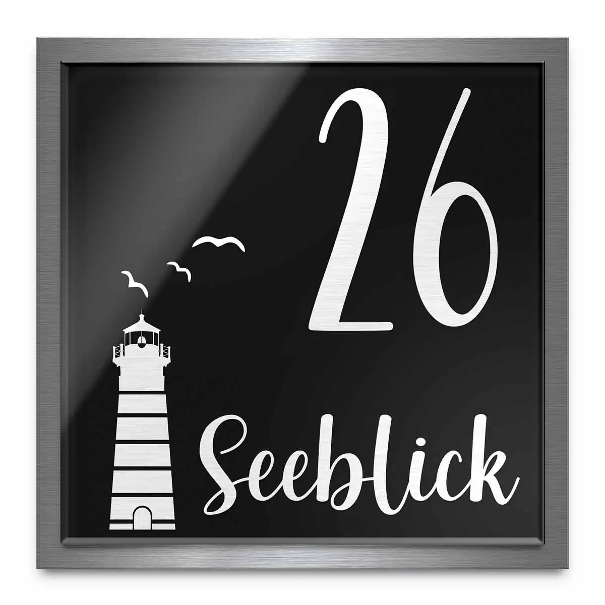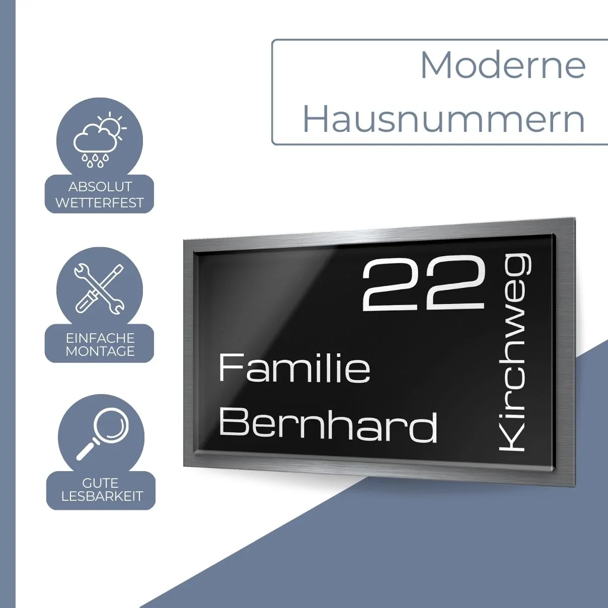 Lass Dich von unserer Premium Hausnummer aus gebürstetem V2A Edelstahl und einer edlen Dekorplatte aus Acrylglas in Deinem Eingangsbereich verzaubern. Das speziell für den Außenbereich hergestellte GS Acrylglas kannst Du ganz nach Deinem Belieben mit Hochglanz Optik in schwarz oder anthrazit auswählen. Die einzigartige Designer Hausnummer überzeugt nicht nur mit ihrer eleganten und zeitlosen Optik, sondern auch durch ihre Robustheit und eignet sich daher ideal für den Außenbereich.