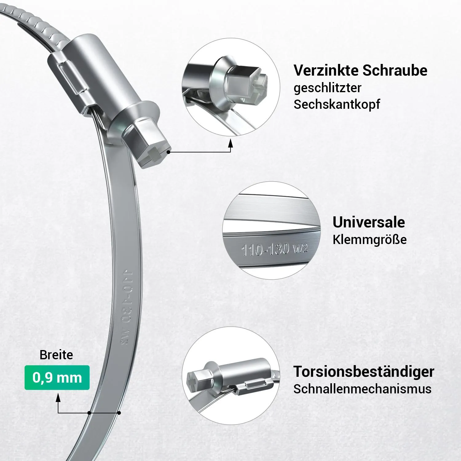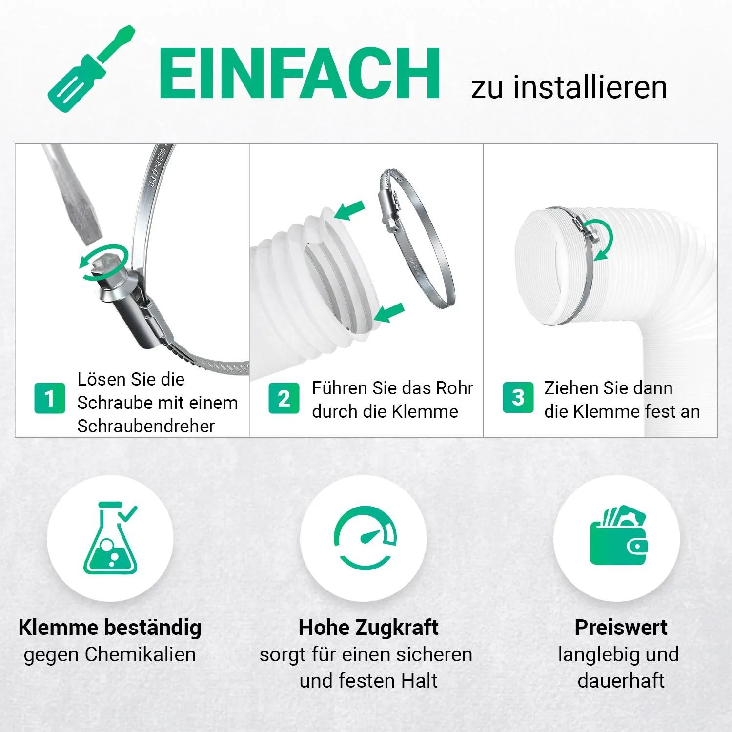 Die Montage von dieser Schlauchschelle ist schnell und unkompliziert. Sie können diese Schlauch Klemme zum Wasserschlauch einfach mit dem Standard-Schraubendreher befestigen. Sie sollen dabei darauf achten, dass Sie die Schraube nicht zu fest zudrehen. Die Ablaufschlauch Klemme soll zwar nicht rutschen, aber auch den Schlauch nicht zu sehr quetschen. So vermeiden Sie mögliche Beschädigungen vom Schlauch. Während der Benutzung soll die Klemme unbeweglich sein, was für perfekte Dichtigkeit des Anschlusses sorgt.