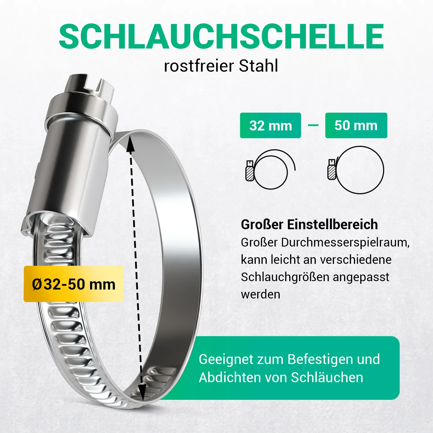 Schelle für Schläuche mit 32 – 50 mm Außendurchmesser.