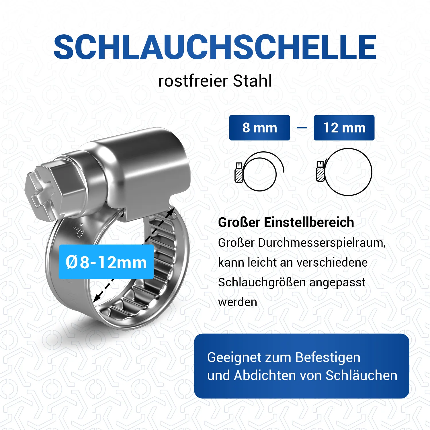 Schelle für Schläuche mit 8 – 12 mm Außendurchmesser.