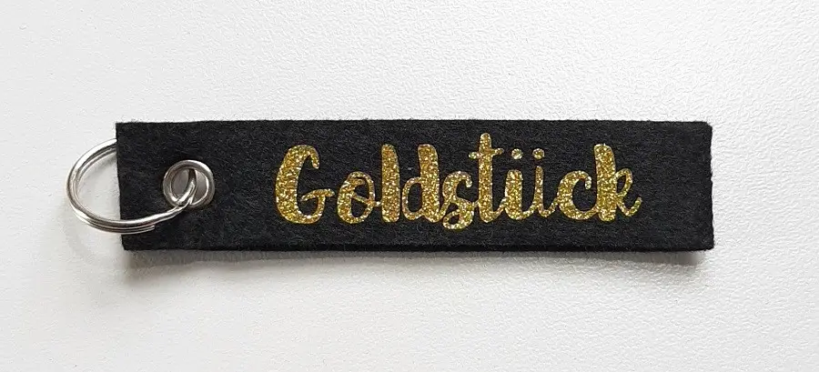 Schlüsselanhänger aus Filz in schwarz mit goldigem Aufdruck: Goldstück
