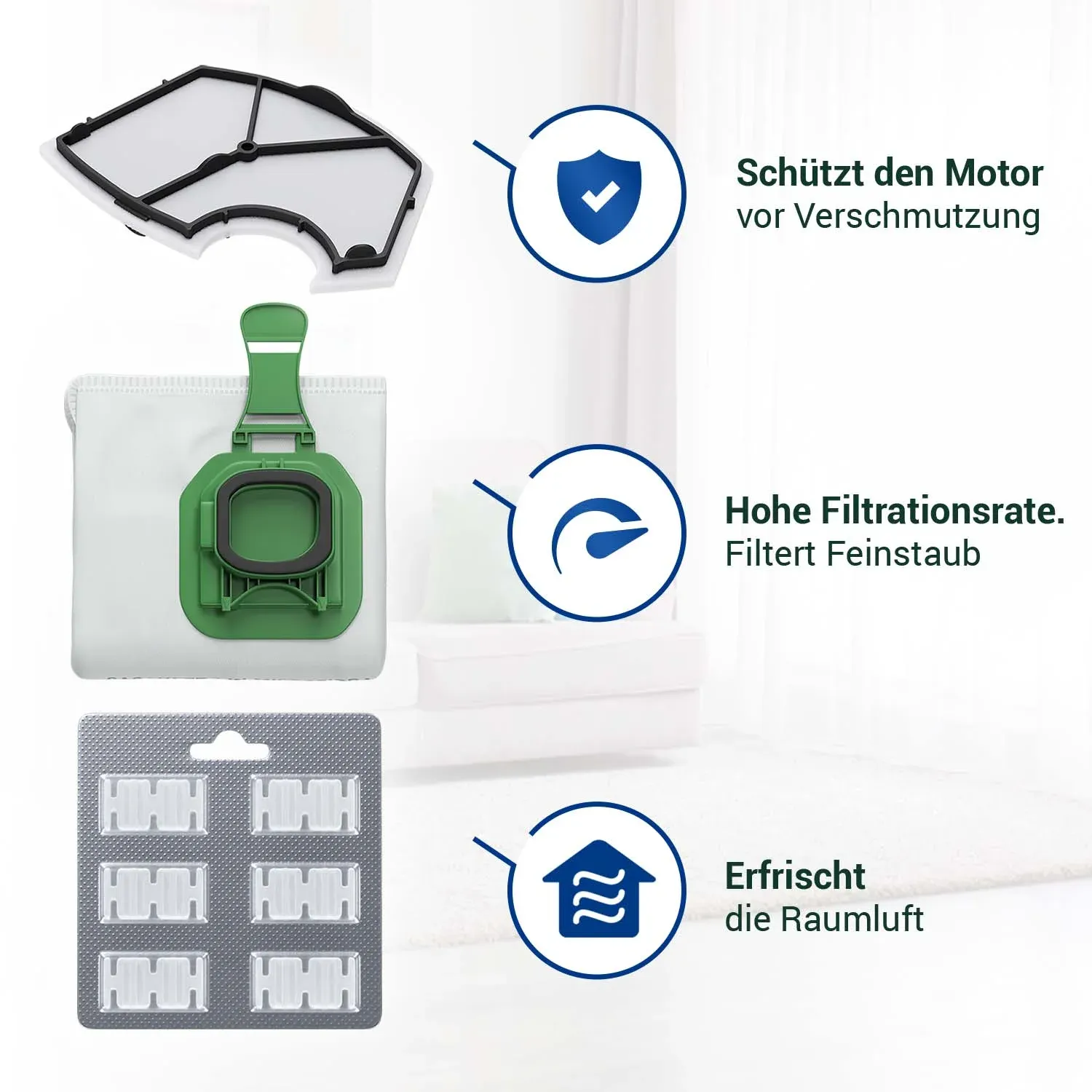 Staubbeutel Set 6x + Duftsticks Set 6x + Motorfilter für Kobold Staubsauger