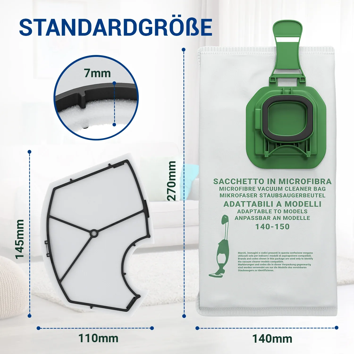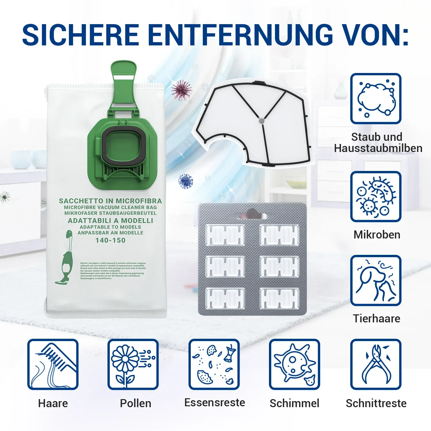 Die Staubsaugerbeutel fangen die kleinsten Verunreinigungen und Allergen auf.